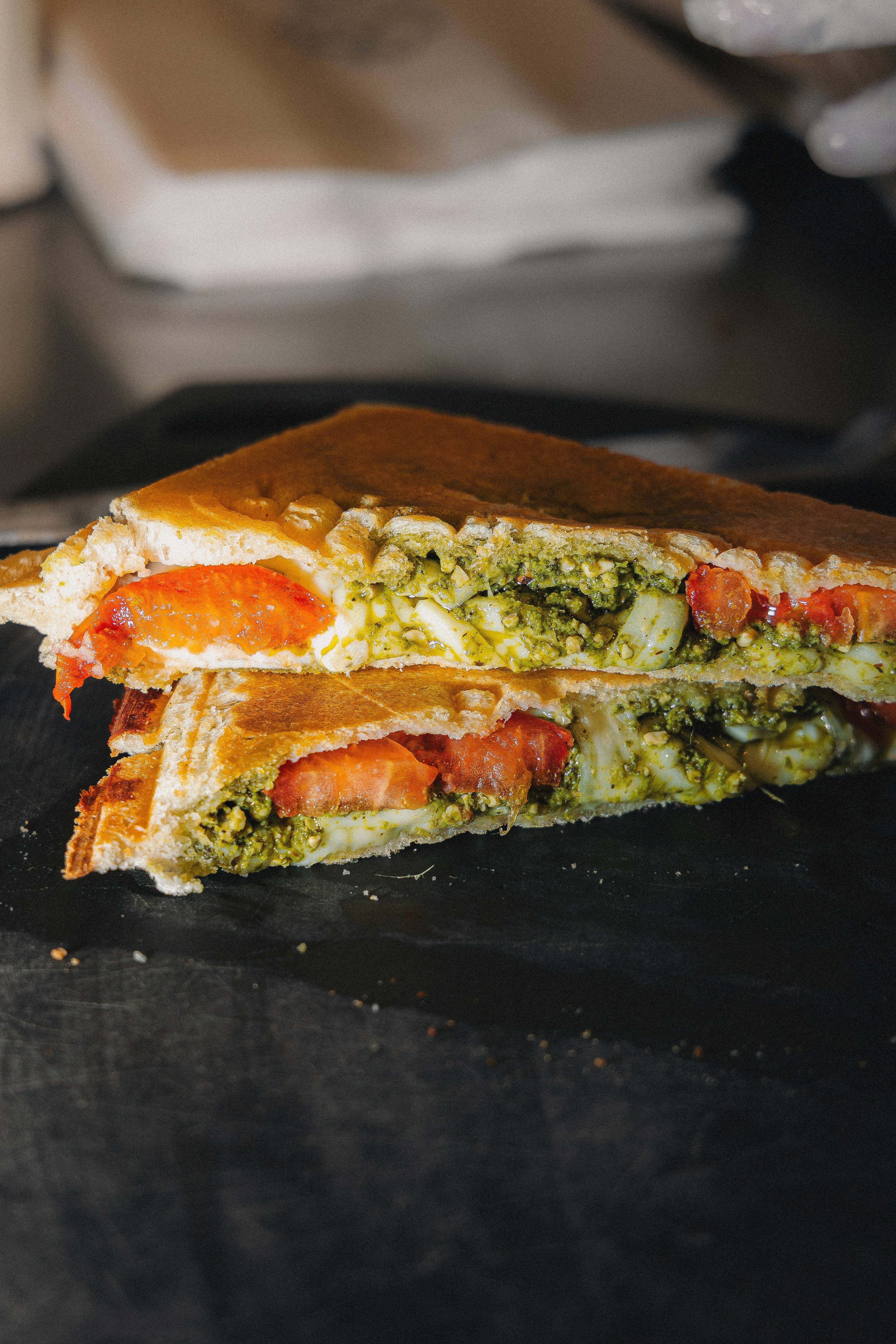 Pain de mie artisanal, tomates, mozzarella, pesto.
