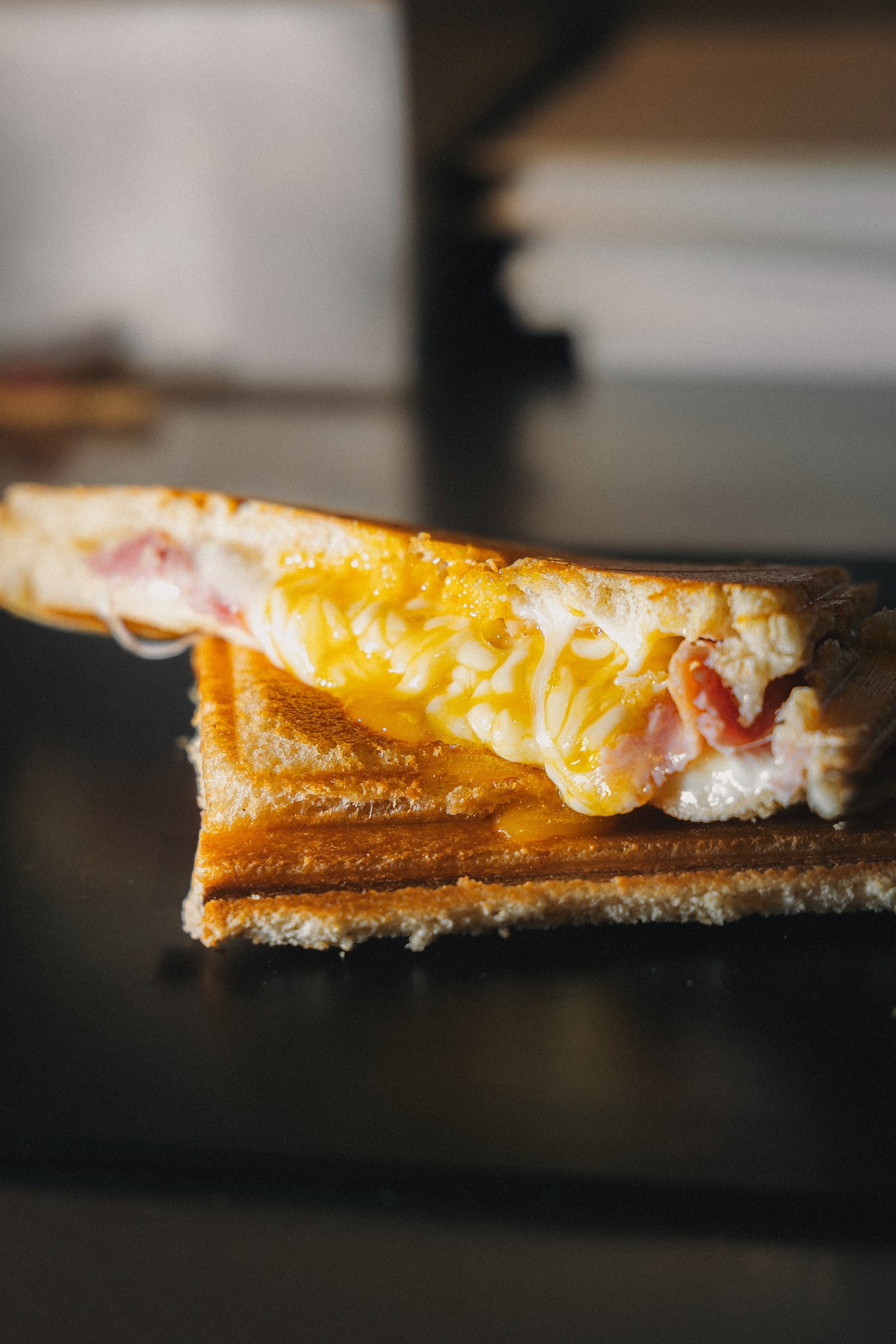 Pain de mie artisanal, beurre demi-sel, mozzarella, jambon de la maison Mauriac, jaune d’œuf.